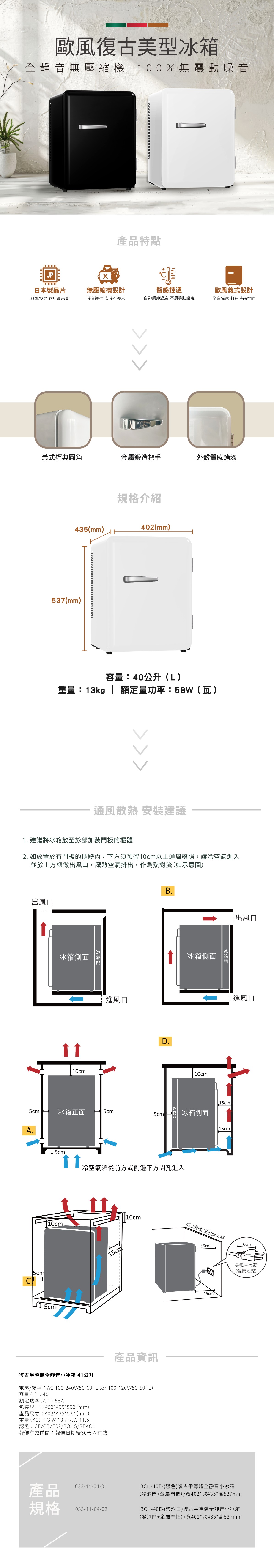 全新美型義大利復古型小冰箱,全靜音無風扇無壓縮機冰箱,40公升大容量,提供黑色及珍珠白色兩色使用。
