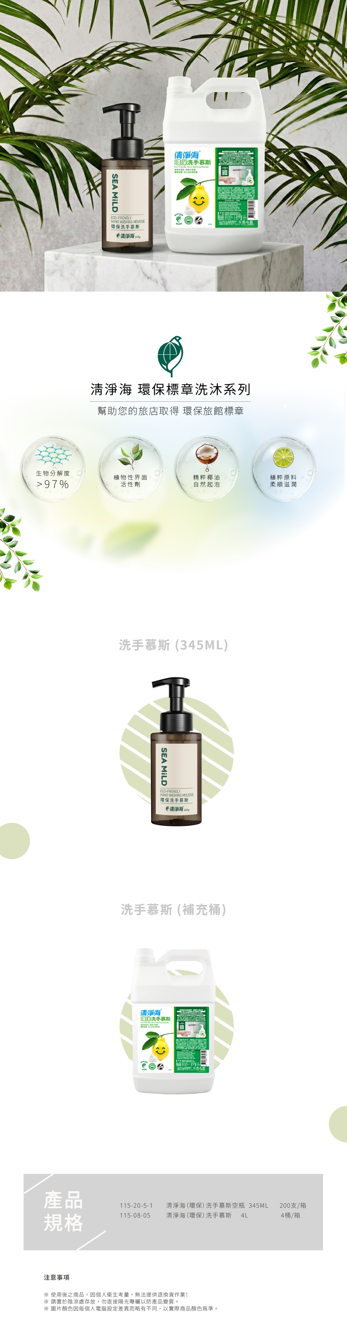 清淨海手部洗護系列,獲得環保標章,好沖洗不滑膩,不乾不澀。植萃來源成分,安心純粹;杜絕有害成分,防疫除菌;綿密細緻泡沫,低敏親膚;高生物分解度,友善生態。