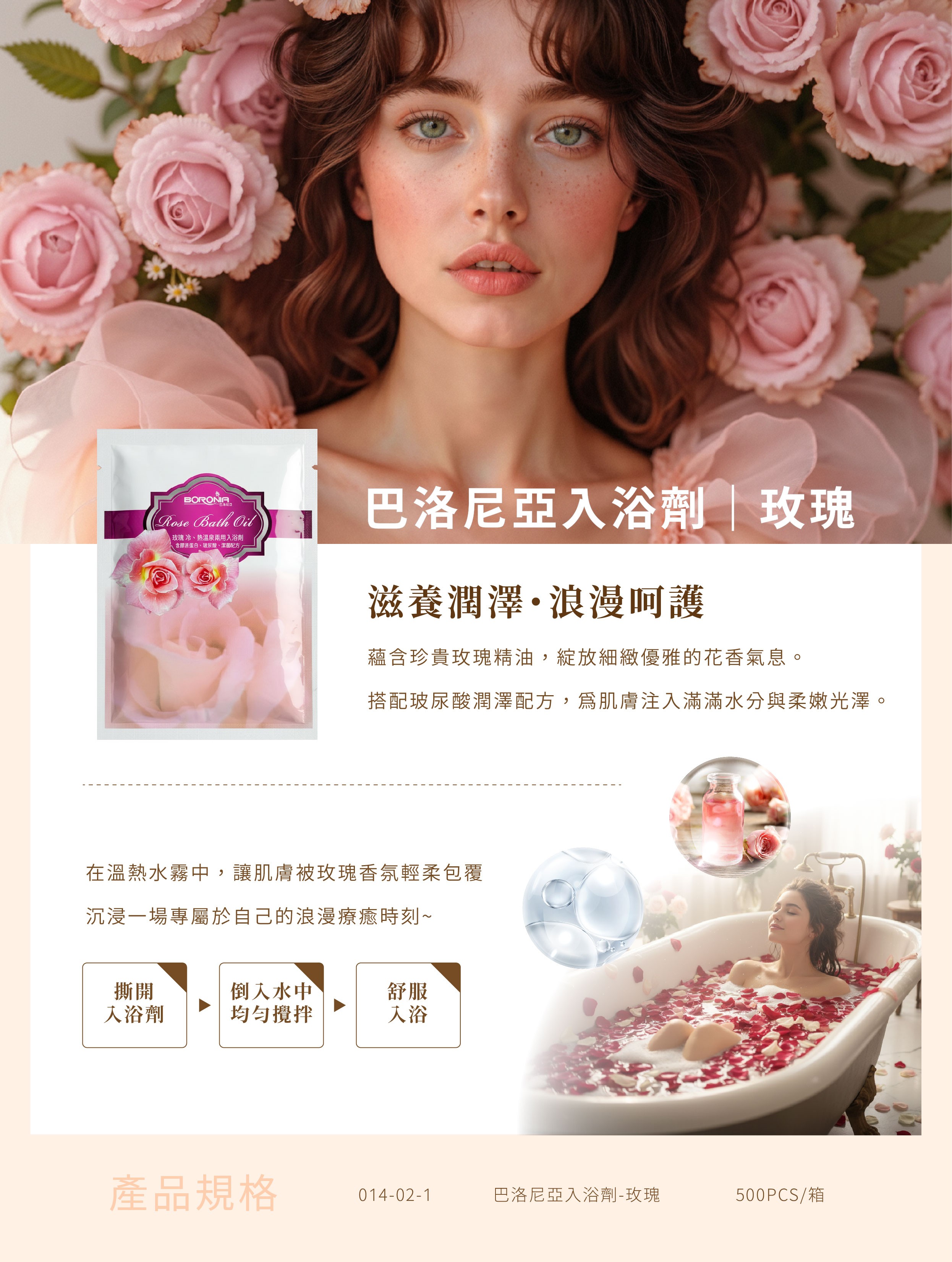 含珍貴的玫瑰精油,散發出浪漫的香氛氣息,添加玻尿酸,使肌膚感受到無比的滋養與潤澤,讓肌膚沉浸在玫瑰香氛擁抱中。<br /> <br /> 500包/箱。中市衛粧廣字第 10407086號